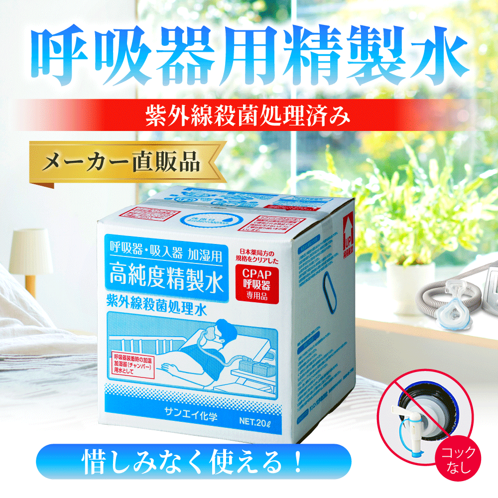 サンエイ化学 精製水 呼吸器用 20L×1箱 コックなし 大容量 | 医療用 水素 吸入器 在宅酸素 水素吸入器 CPAP シーパップ 睡眠時 無呼吸症候群 SAS チャンバー 鼻うがい スチーマー 高純度精製水 純水 蒸留水 イオン交換水 超純水 グッズ 医療器具 せいせいすい 日本製
